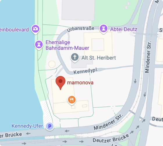 Sie erreichen uns in Deutz mit den KVB-Linien 1, 7 und 9, Buslinien 150 und 153 (jeweils die Haltestelle Deutzer Freiheit) sowie den KVB Linien 3 und 4 und allen S-Bahnen (Haltestelle Deutzer Bahnhof).